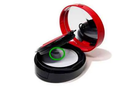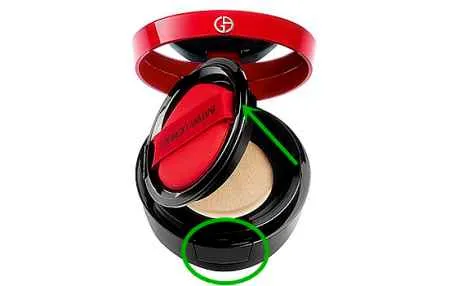 阿玛尼的红气垫在LOGO下黑色的部分有一个可以按压的按键,就是图中绿色框选出的地方。