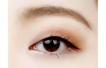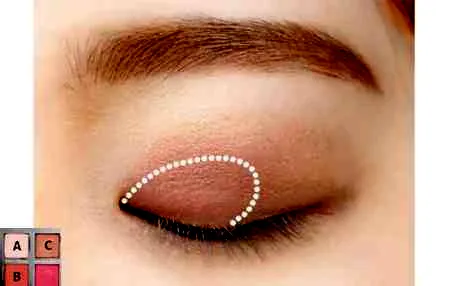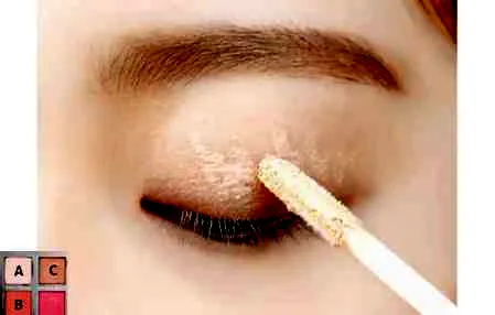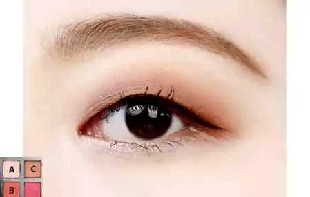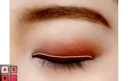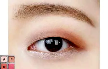 第四步:为了让眼睛更深邃,用C色沿着睫毛根部细细刷上,范围刚好是眼睛的长度,不需要拉长。