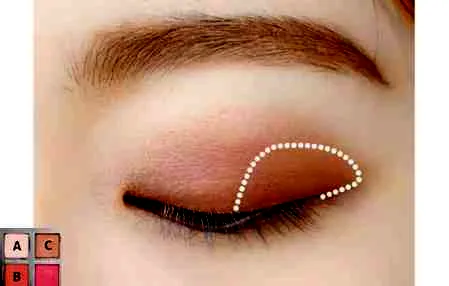 第三步:使用红棕色的B涂抹于后半段,同样也要大面积晕染开,还是要少量多次,不要着急慢慢晕开,这样才能在睁眼后看见眼影。