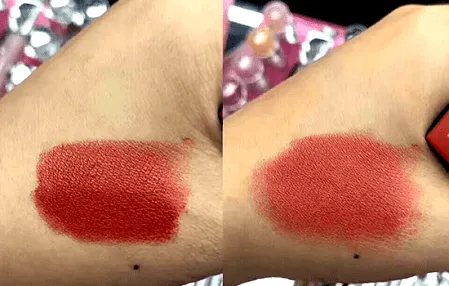 外层的正红色与夹心的金属感的橘调金闪叠加后,涂在嘴上就是略带橘调带着金闪的红。但与其说是金闪不如说是金属感的偏光,虽然只是轻微,但涂出来会有点贵气的感觉。