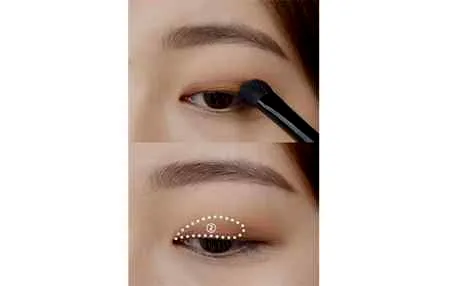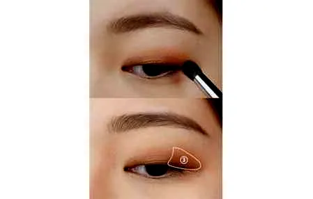 第二步:沾取哑光橘色眼影,从眼头开始涂抹至上眼皮的2/3处,轻轻晕染开,不要有明显的边界线,可以少量多次,避免颜色不均匀。