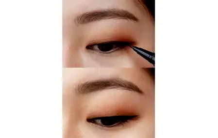 第四步:用眼线笔填满睫毛根部,不要留白,结尾微微上扬,这里用的黑色的眼线笔,也可以用棕色的眼线笔,会更加自然。