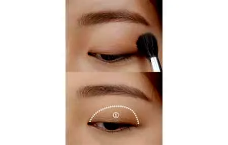 第一步:用稍微蓬松点的眼影刷沾取取哑光米白色眼影,大范围铺满上眼皮至眼窝处。