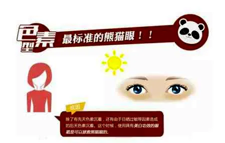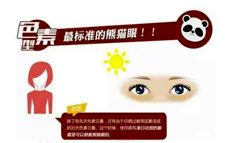 咖啡色是属于色素型黑眼圈,是最标准的熊猫眼,除了先天的色素沉着之外,还有由于日晒、过敏等原因导致后天色素沉着,这种类型的黑眼圈可以用美白型的眼霜拯救,还要注意日常的防晒。