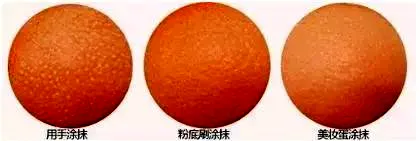越来越多喜欢使用美妆蛋,因为它的妆感自然、修饰效果好,而且还可以非常快速的上妆,比如下图分别是用手、粉底刷、美妆蛋涂抹橘子皮之后的效果,美妆蛋涂抹后,橘子皮的毛孔淡了很多,并且十分自然。
