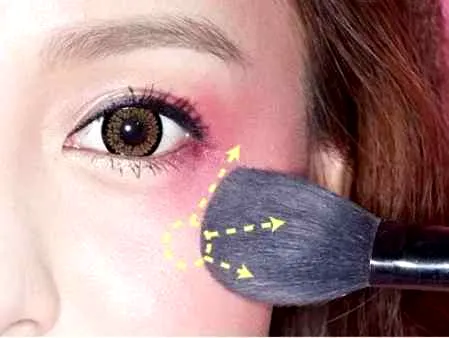 接着在使用眼影刷沾取桃粉色腮红,加强涂刷在眼尾处,如图,完成。
