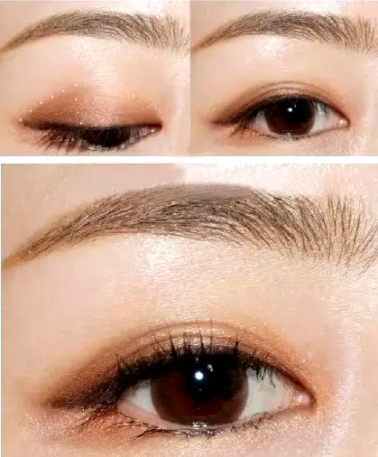 Step1:首先用浅棕色眼影混合橘色眼影,然后在上眼皮的前后两端和下眼睑尾部涂抹。