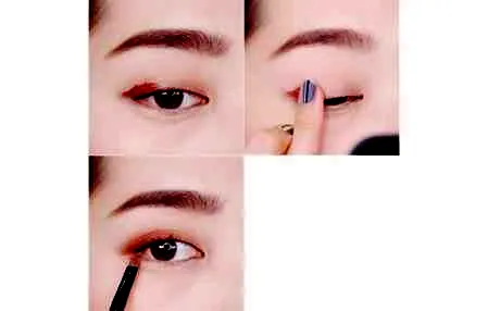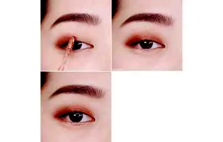 第一步:先在眼皮上用眼部打底产品打底,在用一个红棕色的液体眼影涂抹在眼尾,用手指往前晕开。