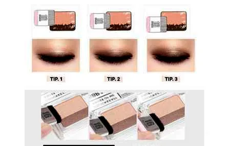 这款眼影只有一个色号,通过自带的眼影刷沾取眼影后,直接一步涂抹到眼皮上,就是一个双色渐变眼妆,可以调整刷子沾取的位置,到控制两个眼影渐变的范围,不同的取粉方式可画出不一样的眼妆,如下图所示。