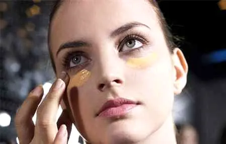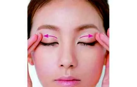 第三步:上眼睑按也用相同方向涂抹,用指腹在上眼睑区域,按照由内而外的方向涂抹薄薄的一层粉底液。
