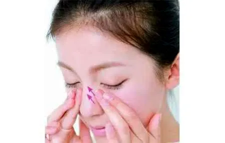 第二步:首先从中心向外涂开,先将手掌搓热,用指腹进行涂抹。从鼻翼两侧朝着太阳穴,均匀地推开粉底液。
