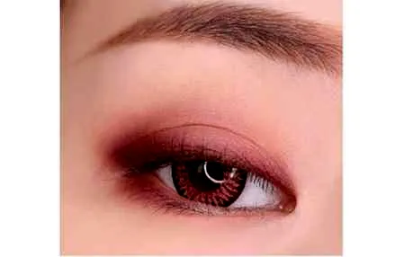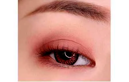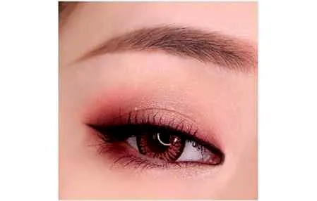 第二步:用锥形刷沾取红色眼影在双眼皮褶皱内涂抹,眼头和眼尾重复涂抹一次,增加深邃感,下眼尾三角区也轻轻的扫一下。