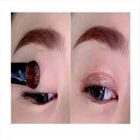 Step2 接下来妹子们再用眼影刷沾取珠光粉紫色眼影,涂抹在上眼皮的双眼皮褶皱内,然后再慢慢的向外晕染开。