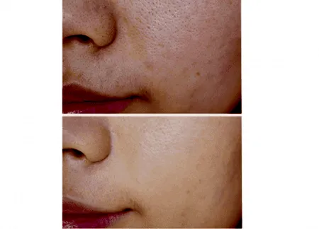 妹子们通过下图能够明显看到使用兰蔻奇迹薄纱粉底液之前的肌敷有痘印、肤色不均、暗沉和泛红等多重问题,而使用兰蔻奇迹薄纱粉底液之后面部大部分的瑕疵是已经小时不见的,而且整个底妆非常的服帖,看起来也非常的有光泽感哟~