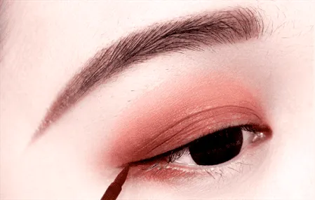Step3 接下来选择一个咖啡色眼线笔,沿着上睫毛根部画一自然上扬的眼线。