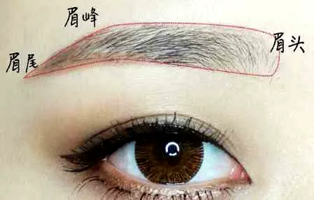 Step2: 接下来用眉笔勾勒出眉毛的形状,为了看得更清楚,下图标志了眉尾、眉峰、眉头的位置,当然大家也可以根据自己的眉形去调整眉峰的位置。