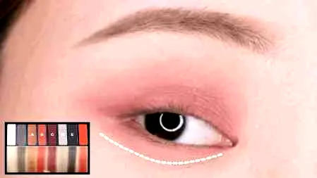 1. C 和 D 两个颜色混合之后,在眼皮虚线部分打底。大概在双眼皮上方 3mm 的程度为止。