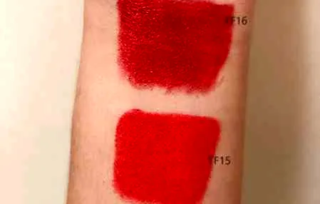TF16和15最大的区别就是颜色,从膏体颜色来看差别就已经很明显,TF16膏体颜色很深,感觉像**色,但是上嘴以后没有这么深。TF15膏体颜色是偏橘调的红色,看起来要亮丽一些,和16号完全不同。