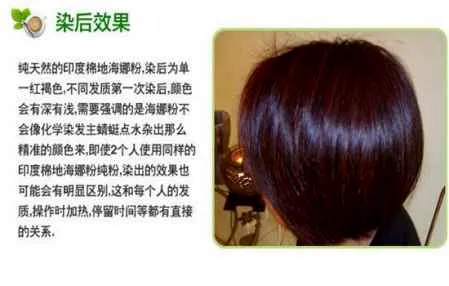 用海娜粉染发,因发质和染发时间等不同颜色不同,有浅棕色,金**、酒红等色,只染白发,黑发染一两次不太上色。染后不褪色,也掉些浮色,再染只染新长出的白发。