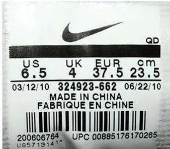 下面来看看耐克男鞋女尺码对照表耐克运动鞋型号,可以通过鞋标、鞋盒贴纸、合格证等地方来识别。使用的格式为6位系列号+3位颜色号,比如315115-112,这个就是鞋子型号。尺码可以通过鞋标和鞋盒贴纸进行查询,耐克运动鞋有US、UK、EUR、CM四个尺码单位,国内是参考EUR尺码,如下图所示: