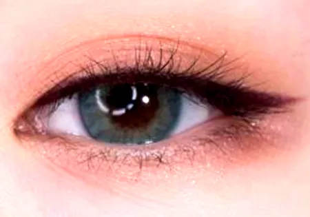 外眼线在睫毛根部上方,内眼线是在睫毛根部下方,要稍微靠近眼球的位置。如果同时画内眼线,可以将两者中间连到一起,这样会比较自然,不能画太粗,会不好看。