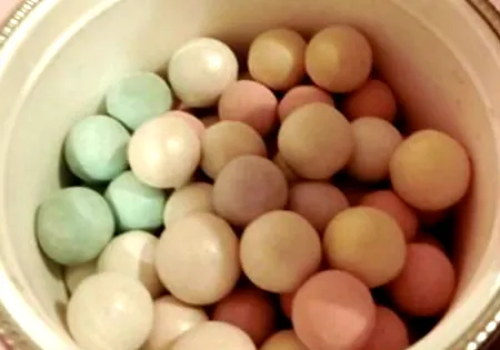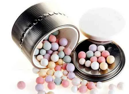 3,粉球碾碎法:把每种颜色的粉球取出来几个,把它们碾碎成细细的粉末,装在一个小盒子里,然后就当散粉来使用。效果也很自然,皮肤亮亮的有光泽。用刷子刷和用粉扑都可以。