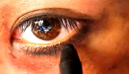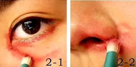 第二步:用红色油彩或眼影,在你需要“**”的部位,勾出大概轮廓,如眼下、眼周、额头、鼻孔、鼻翼周围、嘴角及其下方**。线条不需要很惊喜,颜色也不需要平铺的很均匀。