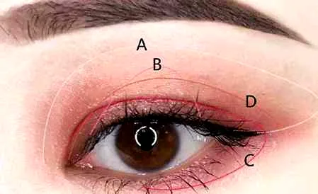 第三步:哑光桃红色眼影刷在双眼皮褶皱内,带过下眼睑的后二分之一位置。