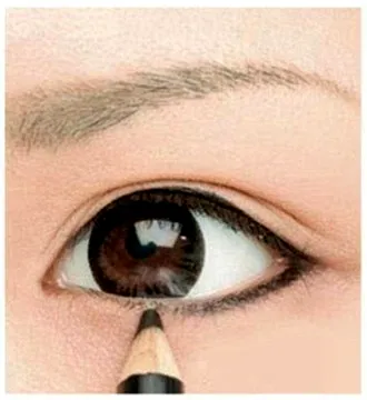 接下来是下眼线部分,眼睛看上面,沿着下睫毛根部由眼球中间画,也要分为3段,外眼角的浓度要与上眼线相同,内眼角部分的眼线画得自然些。