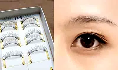 Step5:既然是蜜糖妆容,那么妆感一定要轻,假睫毛尽量选择纤长自然型最佳,从眼头往眼尾粘贴好,快速调整弧度。