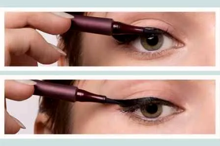 STEP 1-2:首先,用黑色眼线液从内眼角开始向外眼角勾勒,先薄再厚。到了外眼角,勾勒出上翘的小小翅膀形状。