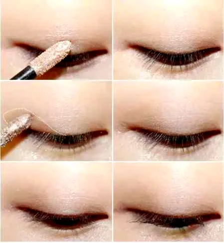 第二步:接下来用浅咖色或者是浅米色的眼影膏,用眼影刷先轻轻在上眼皮的后半部分进行着色,然后再用咖色眼线笔沿着睫毛根部轻画一条眼线,注意不要在眼尾位置做拉长处理;