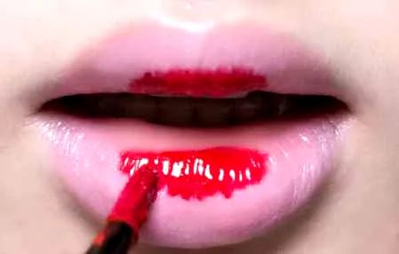 步骤二:再用红色染唇液点涂在双唇内侧中间部分
