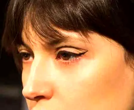 在刚刚画好的区域内,先从紧贴睫毛的眼线开始,从眼头向眼尾处逐渐加重加宽,直到据眼线的转角位置的1/3处,折向双眼皮眼褶上的眼线,描画的过程保证整洁清晰。
