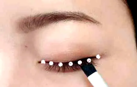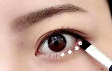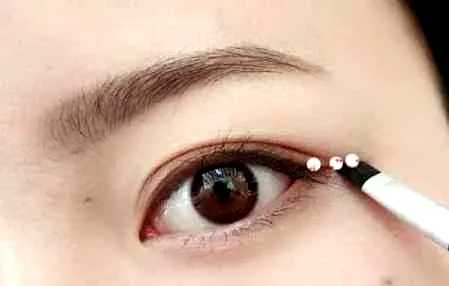 步骤十:眼线的部分依旧是用深棕色眼影粉代替眼线笔来沿着睫毛根部轻轻描画