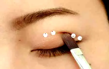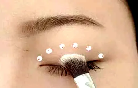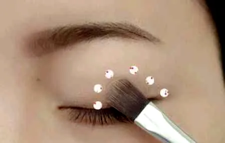 步骤七:在图中标记的地方眼影刷微微嵌进去来回晕染制造眼窝效果