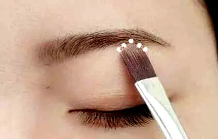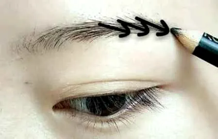 步骤一:上完底妆后,用眉笔轻轻地按照图中标记的方向一根一根的化,要一笔到底,化眉毛的后半部分。相比于眉粉,这样化出来的眉形根根分明,更加自然
