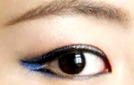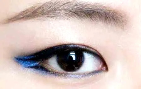 2.眼线刷上剩余的眼影沿下眼线后三分之一进行勾画,与天蓝色眼影形成呼应。
