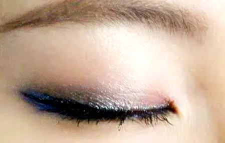 用眼影刷沾取银色、银灰色珠光眼影或此类颜色的珠光眼线笔,沿着上眼线着色,让眼妆bling bling起来~~~