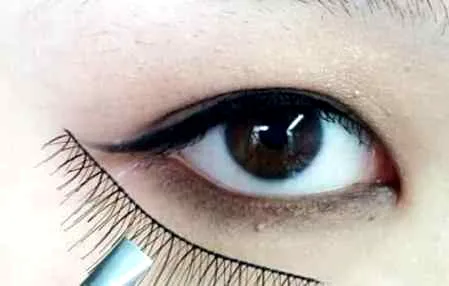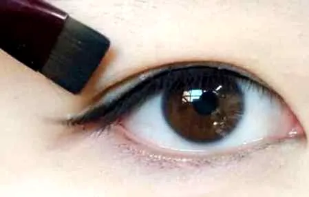 眼线笔填实睫毛根部和内眼睑,眼尾稍许上扬。