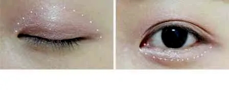 STEP5:沿着在第四步中按压处的那根直线左右来回轻扫,直到逐渐和粉色眼影融合为止。这步一定要谨慎,成败在此一步。