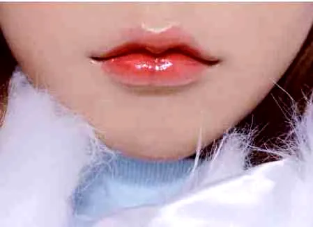 第二步:唇部护理后使用橘红色唇膏,在嘴唇上涂抹出一点点的咬唇妆效果。