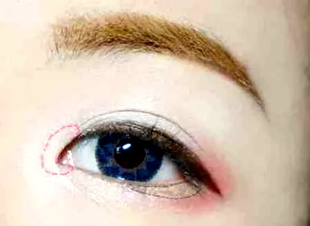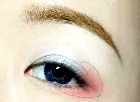 第二步:上下眼尾都需要涂上哑光粉色,呈U型状,一点点土,不能涂太多。