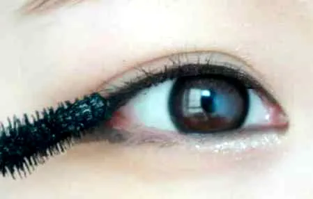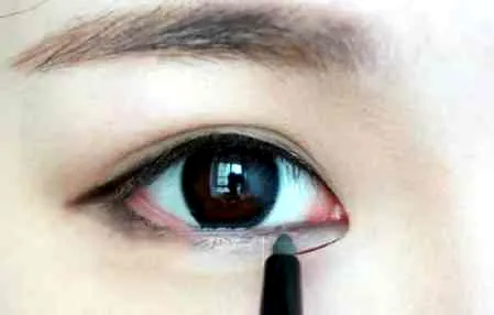 第八步:下眼线前三分之一段画一条若有若无的内眼线,下笔要轻轻地,下眼线中间的一段留白。