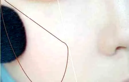 第四步:取阴影色做鼻影,从眉端不越过眼角水平线的位置涂抹,要反复涂几次,直到比较显色为止,这样的鼻影也很减龄哦!