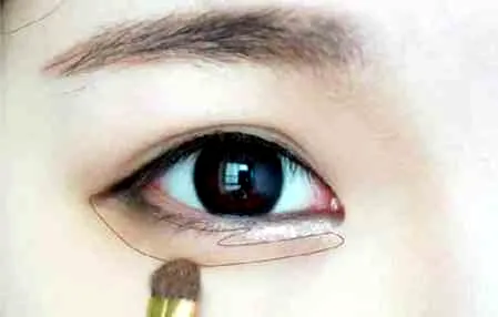 第十三步:为了眼睛更有深邃感,可以取眉粉的两个中间色来打造眼下方的阴影。注意晕染,宽度大约在6mm左右,避开之前画的卧蚕。