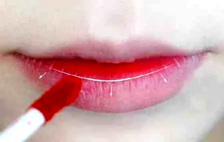 第十四步:用染色唇液做唇部打底,打造自然红润的唇妆效果,在双唇的内侧染上**红色。