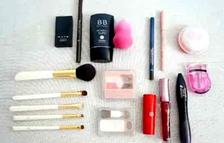 双眼皮贴、kate三色眉粉、爱丽小屋眉笔。heynatureBB霜、葫芦棉、爱丽小屋眼线笔、holike卧蚕笔、爱丽小屋腮红、贝印睫毛夹、兰蔻巨星璀璨睫毛膏、爱丽小屋染色唇彩、阿玛尼CC唇膏、倩丽鼻影粉、canmake五色眼影。