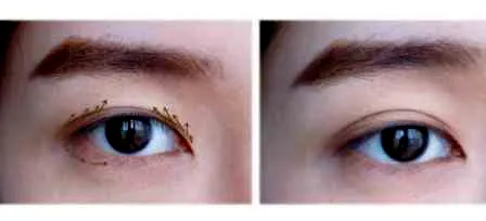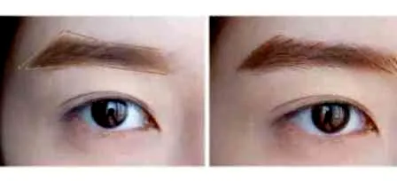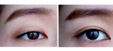 第一步:三色眉粉的中间色与深色混合,在眉毛上画出大概眉形,且眉峰要突出,画出鹿晗的那种英气眉。DOLLWLNK棕色眼线液笔,用棕色眼线液笔勾勒出前后眉毛的生长走向,增加眉量。