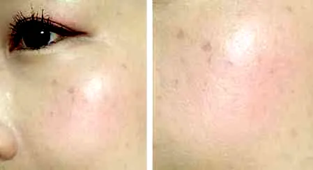 2.眼影用法:腮红也可以活用来当眼影使用,淡淡的珊瑚红色,非常漂亮,显色度高。未涂腮红前,只打过底的肌肤状态。
